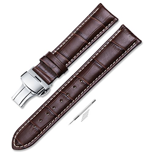 iStrap 22mm Calf Leather Stitched Replacement Watch Band Push Button Deployment Buckle Strap Brown
