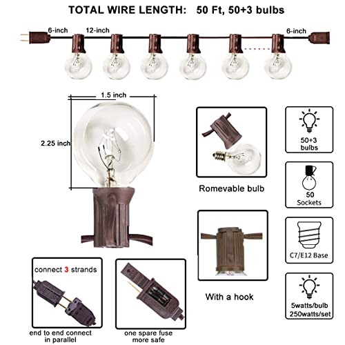 Click for More Images Globe outdoor lights: G40 outside patio string light come with 1 spare fuse for replacing, 50 clear Edison g40 bulbs, 3 spare replacement bulbs. 1.5-inch each light bulb, e7 or e12 candelabra socket base, 5w per bulb....