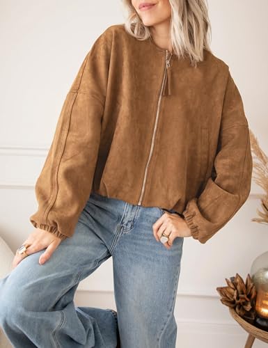 Click for More Images Materail: the cropped casual jackets for women is made of 94%%Polyester, 6%Spandex, it is soft, durable and comfortable for daily wearFeatures: this faux suede bomber jacket women features crew neck, zip up closure, two side...