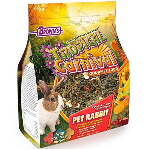 Brown’s Tropical Carnival Gourmet Pet Rabbit Food with High-Fiber Timothy and Alfalfa Hay Pellets is a vitamin-nutrient-fortified food and treat, all-in-one. This premium gourmet food is specifically formulated for the daily dietary needs of rabbits, jam-packed with a medley of delicacies. We have included fiber-rich Timothy and Alfalfa Hay Pellets and beneficial bacteria to support good digestion, the perfect sized bites of fruits, veggies seeds and grains, plus our nutrient-rich zoo-vital biscuits. Your rabbit will find Tropical Carnival simply irresistible.