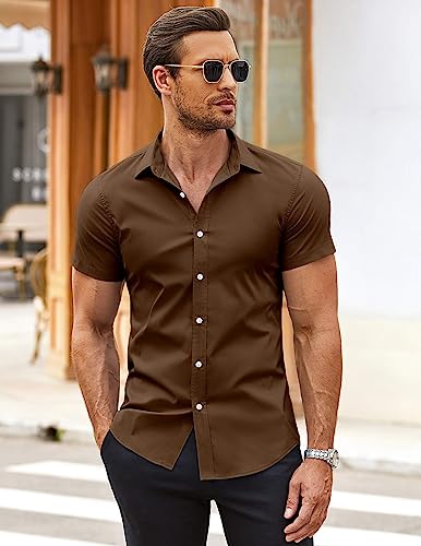 COOFANDY Men’s Casual Shirt Short Sleeve Button Down Slim Fit Shirt for Men Brown