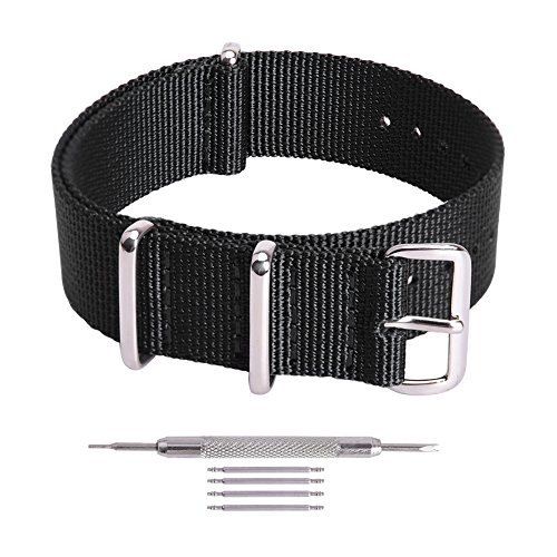 Specifications: Band Material: Nylon material and the stainless steel buckle Thickness: 1.6mm Hole: 13 holes OPTIMAL FIT: Total Length: 10.8-inches; Width: 18mm, 20mm, 22mm; fits wrists 5 to 9 in circumference, and covers most of the watch size on...