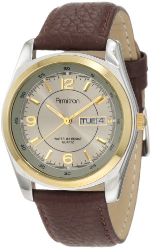 Scratch resistant mineral crystal lens and Japanese quartz movementClassic and classy, this two-tone watch from Armitron is the perfect complement to your dress or casual wardrobe. The round silvertone case and goldtone bezel frame a silver dial...