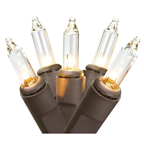 Christmas mini lights with 100 clear lights on brown wire/cord 100 clear lights on brown wire; 42 Watts per stringif 1 bulb burns out and is left in the socket, the remaining 99 lights will stay litUL listed for indoor and outdoor use (complies...