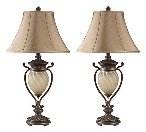 A dark brown and aged glass table lamp topeed with a textured art silk bell shade and features a 4-way switch and night light. TRADITIONAL TABLE LAMPS: You'll feel like royalty with this set of 2 lamps glowing in your bedroom or living room...