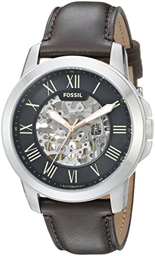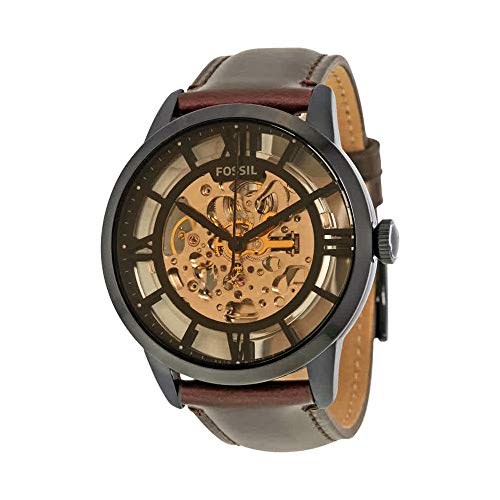 Fossil Men's Townsman Stainless steel case, Leather strap, Brown dial, Automatic movement, Scratch resistant mineral, Water resistant up to 5 ATM - 50 meters - 165 feet Round Stainless Steel watch featuring skeleton dial with Roman numeral and...
