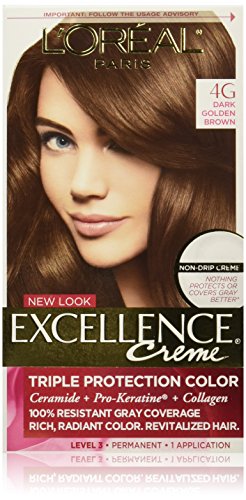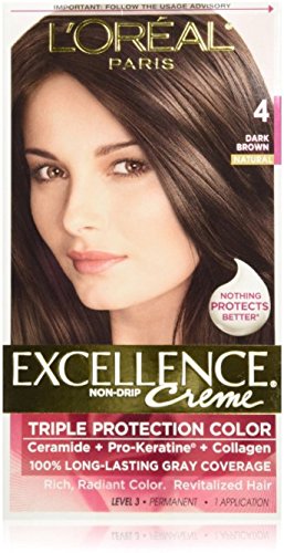 L'Oreal Paris Excellence Creme Hair Color, 4 Dark Brown RADIANT HAIR COLOR WITH TRIPLE PROTECTION: No hair color cares more than Excellence Crème. With our triple protection system that seals, replenishes, and conditions, plus 100% gray coverage...