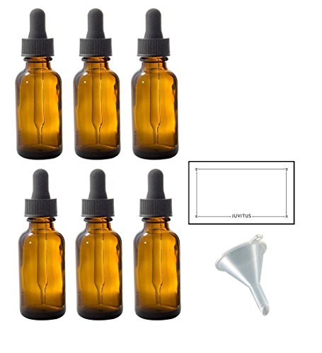 Includes 6 - 30 ml / 1 ounce Amber Glass Boston Round Dropper Bottles + Funnel and Labels. Our amber glass bottles are made of true dark brown amber glass (never painted or treated) and are perfect for storing product (such as essential oils)...