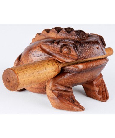These handmade light brown wood musical croaking frogs - also called a frog rasp - come in six sizes. This one is one of our larger versions and is 9"L x 5"W x 5"H. Stroke his back and listen to him croaking and sing ribbit like a real frog does....