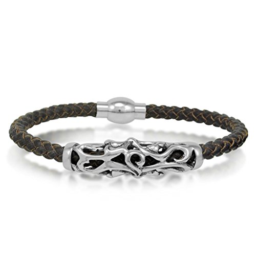 Oxford Ivy Braided Brown Leather Mens Bracelet 5 mm 8 1/2 inches with Magnetic Stainless Steel Clasp