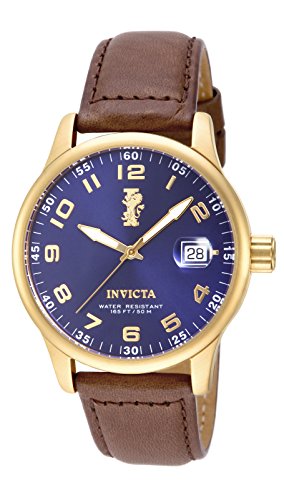 Creating a luxurious and stylish display with a vibrant color scheme of dark brown genuine leather, 18-karat gold plated stainless steel and a sunray blue dial, this I-Force timepiece from Invicta makes a handsome addition to any gentleman's...