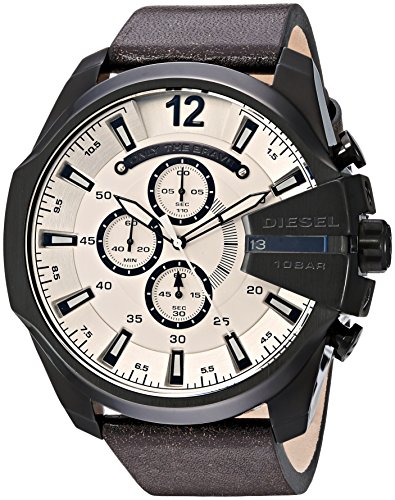 Be a leader, not a follower, in the black IP Diesel Mega Chief watch. The edgy white sunray chronograph dial features a smoke lens crystal, shiny black indexes with white printed tracking and a black IP Only the Brave tag. A dark brown leather...