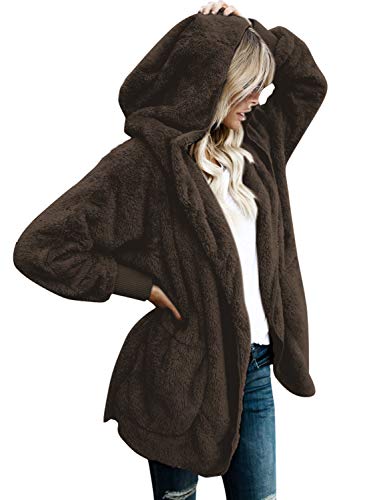 LookbookStore Women's Oversized Open Front Fleece Hooded Faux Fur Long Dolman Sleeves Fuzzy Draped Collar Pocket Cardigan Coat Jacket OutwearCasual faux fur cardigan coatDolman sleeve / open front / draped collarHooded fleece coat jacketFuzzy...