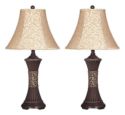 A bronze and gold finished open work table lamp topped with a bell shade and features a 3-way switch. SET OF 2 TRADITIONAL LAMPS: Elevate your home with a sense of refinement. These lamps are designed with the beloved vine motif, twisting and...