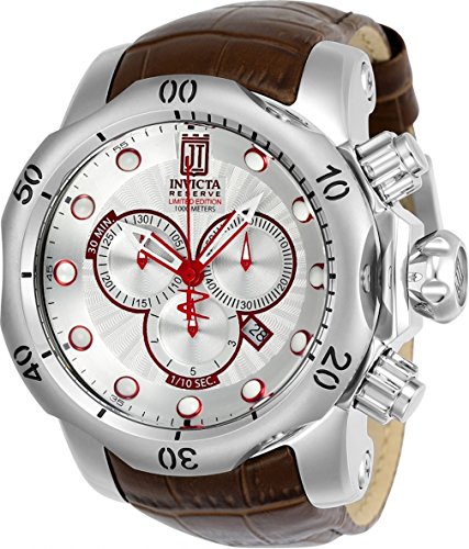 Silver metal dial with red luminous hands and hour markers, chronograph with 60s, 1/10th and 30m subdials, date display, brown leather band and screw down crown53.7mm stainless steel case with flame fusion crystalQuartz MovementCase Diameter:...