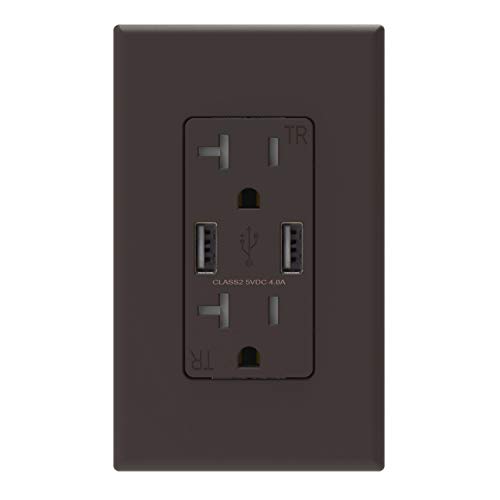 ELEGRP USB Charger Wall Outlet, Dual High Speed 4.0 Amp USB Ports with Smart Chip, 20 Amp Duplex Tamper Resistant Receptacle Plug NEMA 5-20R, Wall Plate Included, UL Listed (1 Pack, Brown) ??High-Speed Charging Tech? In-wall duplex receptacles...