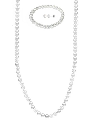 Beaurtiful pearl set includes 18" necklace, stretch bracelet (to fit various sizes) and stud earrings. Sterling silver plated in rhodium and boxed for a ready made gift. The perfect option for you or to present to that special lady in your...