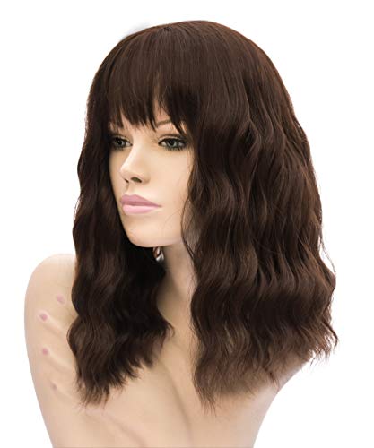 Length: 11"Bangs length: 5.12 "Materials: Heat resistant and capable of withstanding temperatures up to 410 degrees FahrenheitSkintop: 3.5" x 2"Cap Size:23"Packing included: 1 x wig It's a short dark brown straight bob wig with bangs, good for...