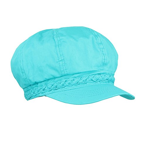 Light weight cotton newsboy cap with braided cotton trim in matching color accents this hat. Traditional style features an 8 panel design, with back elastic inset for a snug fit up to 24 inches- One size fits most. Front brim measures 2 inches...
