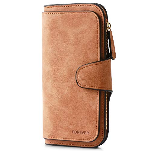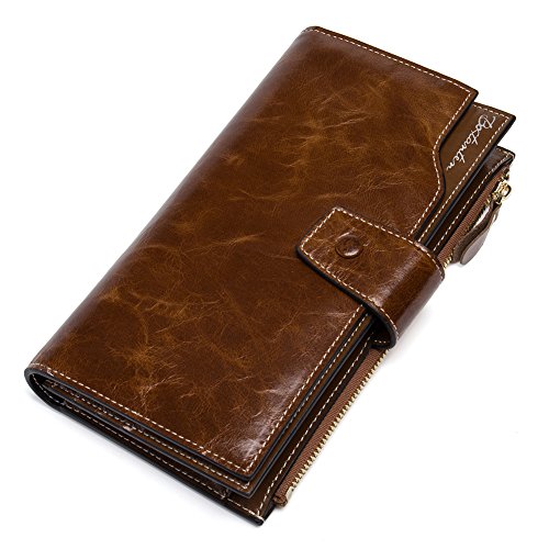 Waxed LeatherDimensions: 7.5"L x 4"W x 1.2"HLARGE ORGANIZER WALLET: There are 10 credit card pockets,1 large capacity zipper pocket,3 bill pockets,2 ID card slotsClosure:Zippered Around & Textured Snap button.1 exterior zippered pocket reveals 2...