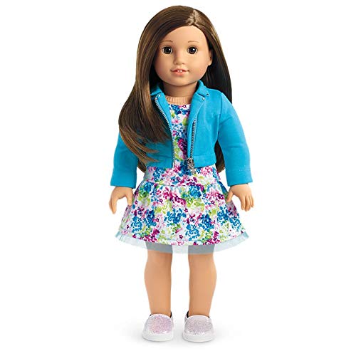 From American Girl:Brown Eyes, Layered Brown Hair, Light Skin Tone. The 18-inch Truly Me doll has a huggable cloth body, eyes that open and close, hair that can be styled, and a movable head and limbs made of smooth vinyl. This doll has light skin tone, layered brown hair, and brown eyes. She arrives wearing a printed dress with a mesh hem, a zip-front moto jacket with a star zipper pull, and glittery flat shoes.