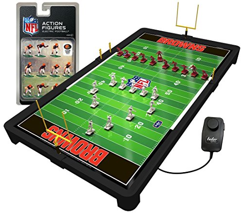 The Cleveland Browns NFL Electric Football set is the world’s favorite football game, and now it’s better than ever! Set your plays and watch your teams do battle on this 24″ x 13″ SpeedTurf metal vibrating NFL gridiron! Includes three teams. The PlayAction remote control places the fate of your offense in the palm of your hand, with its on-board variable speed control. Two teams are outfitted with all new Invisibase Cleat technology, sending players where you want them to go. Watch the play develop, stop the action to handoff or pass, then shift into high speed and accelerate your team to victory!