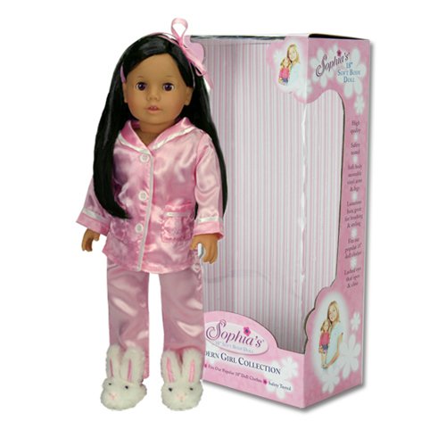 Beautiful 18″ vinyl doll with soft body and moveable arms and legs. Dark brown hair and brown eyes. Light pink satin pajama set and adorable bunny slippers included! Comes in display box. Made by Sophia’s, Leading Doll Clothes Manufacturer, Not affiliated with American Girl®, Reg. Trademark of American Girl, LLC.