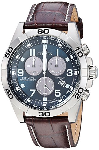 Silver-tone titanium case with a brown leather strap. Silver-tone bezel. Dark blue dial with silver-tone hands and Arabic numeral and index hour markers. Second markers and tachymeter around outer rim. Dial Type: Analog. Luminescent hands and markers. Date display at the 4 o’clock position. Eco-drive movement. Round case shape, case size: 43 mm, case thickness: 12 mm. Water resistant at 100 meters / 330 feet. Functions: chronograph, date, hour, minute, second. Sport watch style. Watch label: Japan Movt. Citizen Brycen Chronograph Dark Blue Dial Men’s Watch BL5551-06L.
