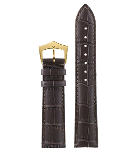 - Dark Brown genuine leather watch bracelet with accentuated tone-on-tone stitch, decent rectangular scales, and gold pin buckle attachment of stainless steel. Length: 75mm+119mm. Height: average 4mm. Width: 12mm. buckle width: 10mm.