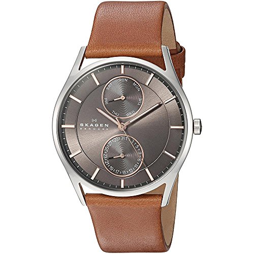 Watch Sizing Guide It’s all in the details and this Skagen™ timepiece leaves no element unnoticed! Pair it with your favorite ensembles for a truly impeccable look! Stainless steel case. Brown leather band features an adjustable buckle closure. Round face. Three-hand analog display with quartz movement. Grey dial features rose gold-tone hour markers and hands, Skagen detailing, a minute track, and two sub-dials. Water resistant 5 ATM/50m. Imported. Measurements: Case Height: 39 mm Case Width: 39 mm Case Depth: 9 mm Band Width: 3?4 in Band Circumference/Length: 8 3?4 in Weight: 1.5 oz This product may have a manufacturer’s warranty. Please visit the manufacturer’s website or contact us at warranty@support.zappos.com for full manufacturer warranty details.