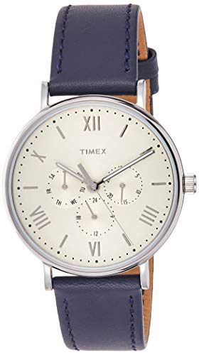 We’ve combined premium style with the precision craftsmanship you’ve come to expect from Timex. The silver-tone multifunction dial and case paired with a rich blue leather 20mm strap give you a distinguished look you can wear from day to night. The dial is marked with silver-tone partial Roman numerals and indices. Three subdials display weekday, date, and 24-hour time. Luminous hands aid with readability in low lighting. This watch is water resistant to 30 meters (99 feet).
